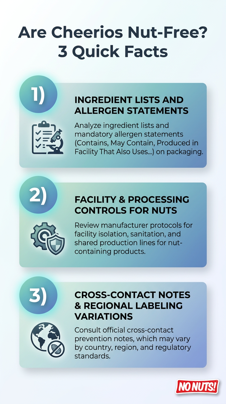 This infographic summarizes three quick facts about whether Cheerios are nut-free. It highlights allergen considerations for readers with nut allergies.